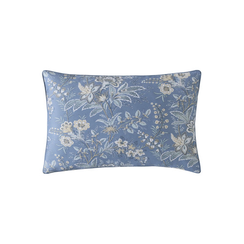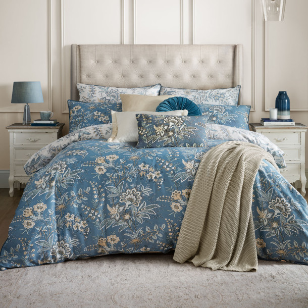 Marlbrook Bed Set with exotic flowers. A bold colour palette of navy, creams and ochre decorates this 200 thread count 100% cotton sateen bed set, finished with an elegant flat piping.