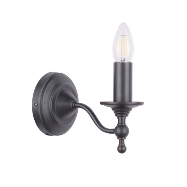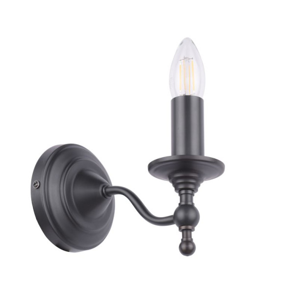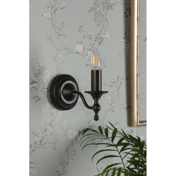 Simple classic design wall light, made of matte black painted metal, ideal for lighting with a candle-style bulb, or by placing a clip-on shade over the bulb (shade not included).