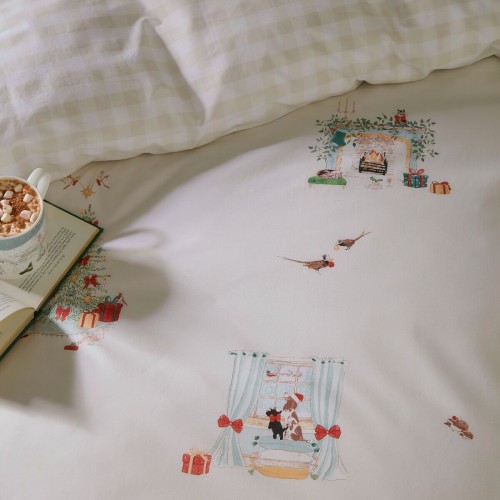 COSY CHRISTMAS duvet cover set in soft misty green, with festive trees, fireplaces and woodland animals. Made from 200 thread count cotton percale, perfect to bring a warm and seasonal touch to your bedroom.