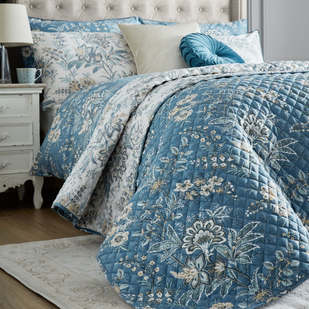 Marlbrook Exotic Flower Quilt in Deep Sea Blue. Measures 235cm x 235cm. By Laura Ashley