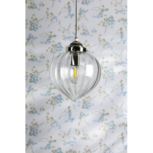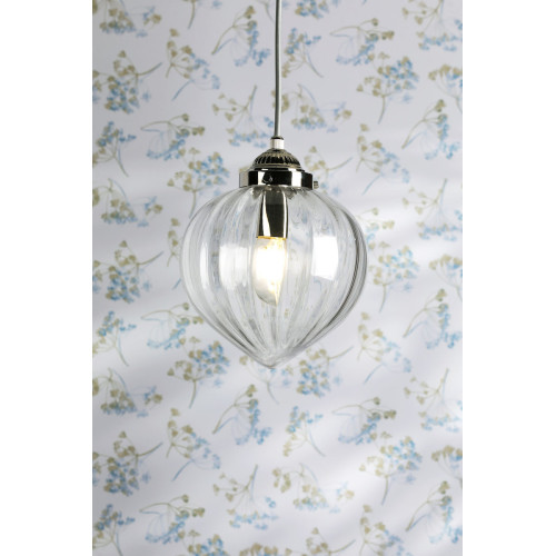 The Laura Ashley Whitham 1 Light Pendant, finished in polished nickel with a clear ribbed glass shade, creates a warm, inviting glow. Perfect for living rooms, bedrooms, or kitchens, with adjustable height.