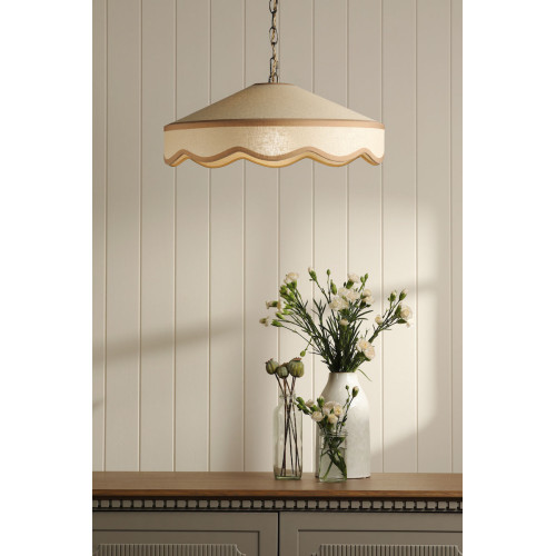 The Laura Ashley Buckenham 1 Light Ceiling Light, with rattan effect shade and contrasting trim, has adjustable height for customisation. Ideal for bedrooms or living rooms.
