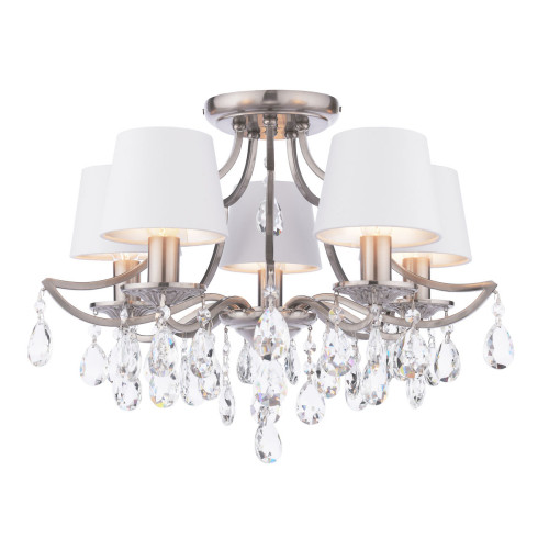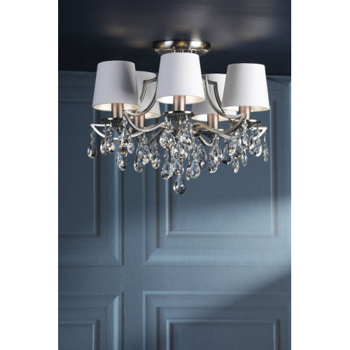 The Laura Ashley 5 Light Semi Flush Ceiling Light, with ivory fabric shades and polished nickel finish, has crystal accents. Perfect for living rooms or bedrooms with lower ceilings.