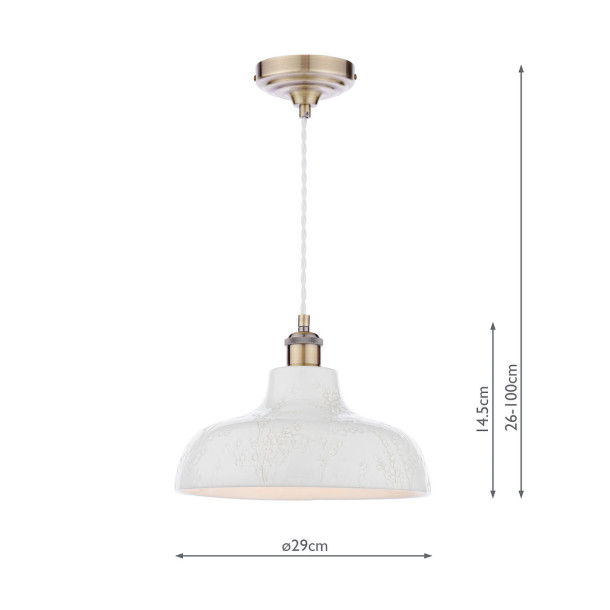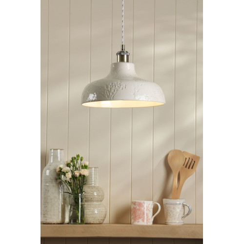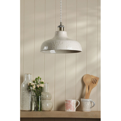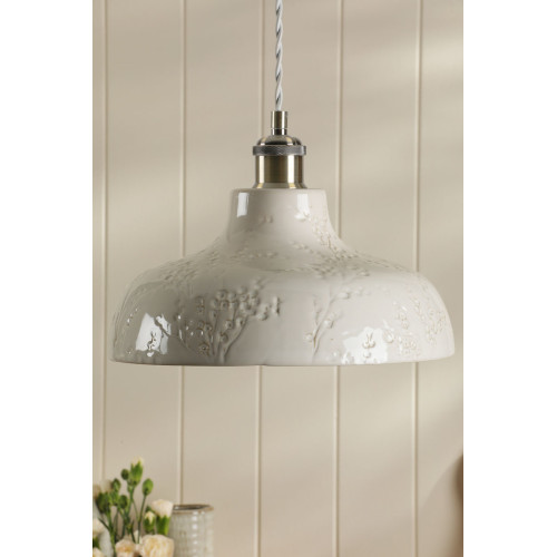 The Laura Ashley Pussywillow Ceramic Pendant, with embossed ceramic base and delicate Pussy Willow branches, creates a warm, serene atmosphere. Ideal for living rooms or kitchens.