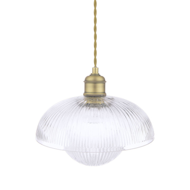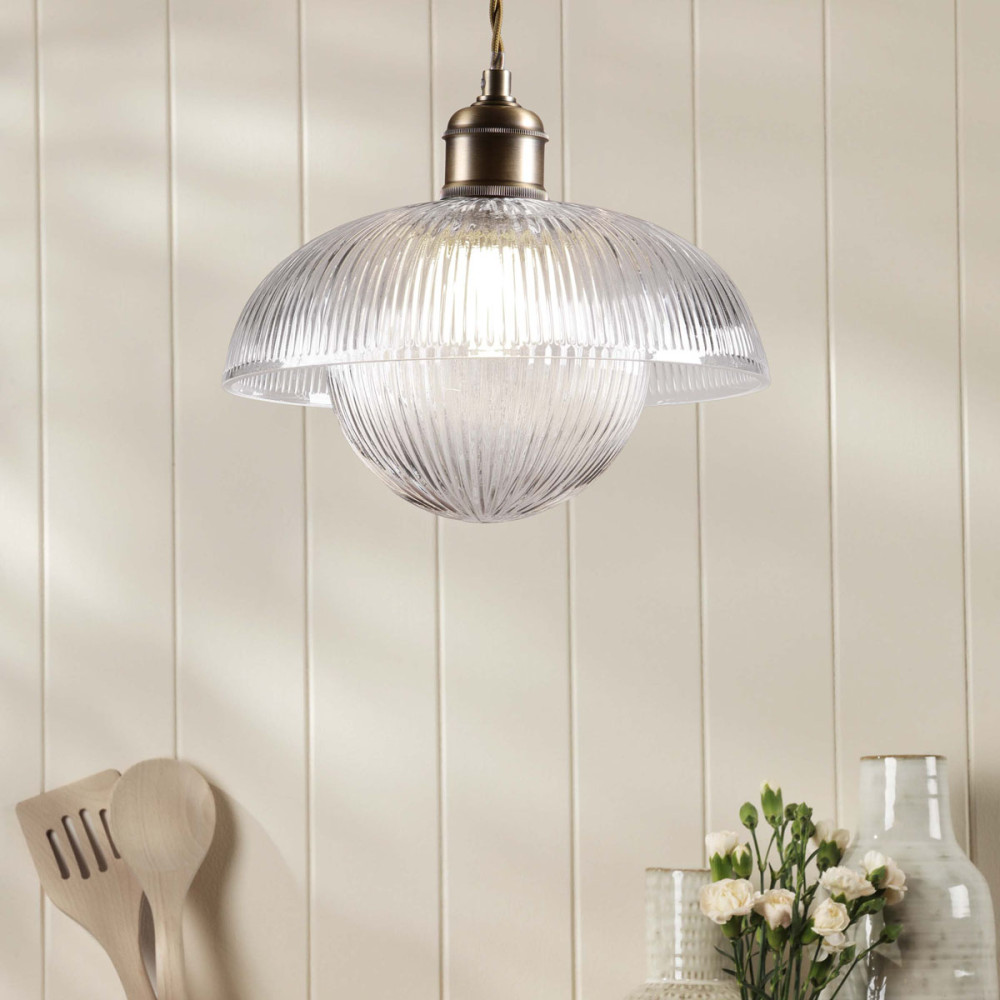 Pendant lamp with antique brass finish and ribbed glass shade. Ideal for stylish kitchens and entryways.