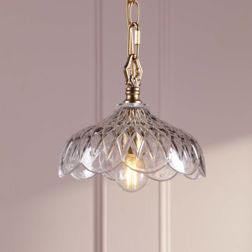 Pendant lamp with antique brass finish and cut glass. Perfect for hallways and kitchens with vintage charm.