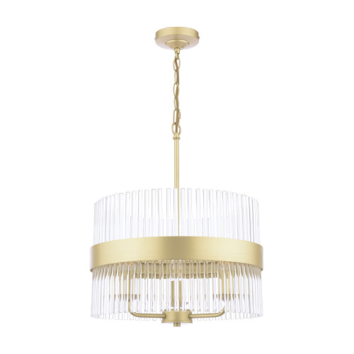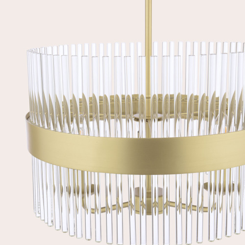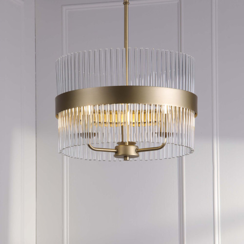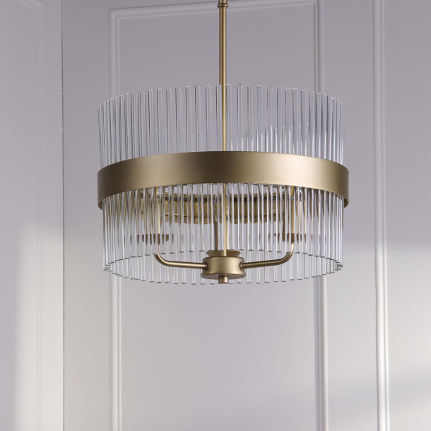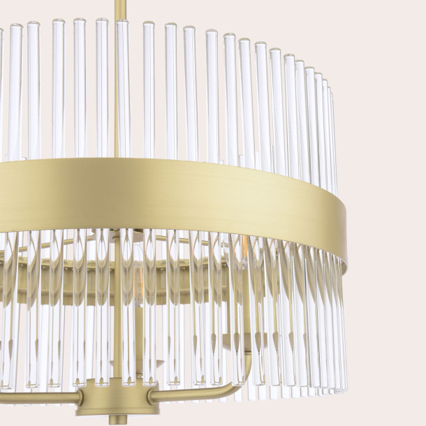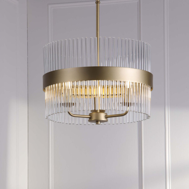 Pendant lamp with three lights, antique brass finish and glass rods. Perfect for retro-style bedrooms.