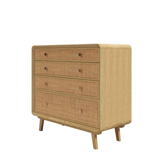 Millen Chest of drawers, in a combination of oak and rattan, with 4 drawers, is made of solid oak and oak veneer with rattan drawer fronts and gold fittings. This chest of drawers has 4 drawers that offer plenty of space for your clothes.