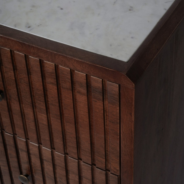 The Carmel Six Drawer Chest is an elegant cabinet featuring intricately carved ridged lines with soft, rounded contours. Crafted from solid mango wood, it includes six evenly spaced drawers topped with an inset layer of luxurious off-white marble. Brass knobs enhance the Art Deco inspired aesthetic. This chest offers ample storage while combining practicality with style. The Carmel collection includes bedside, 6 drawer chest, and mirrors.