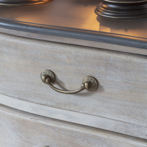 Natural wood chest with 4 drawers, soft curved designs, combining a natural wood body with slate gray tops. Decorative antique bronze hardware and locks for a traditional style.