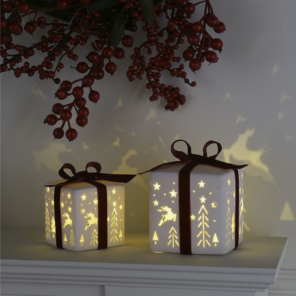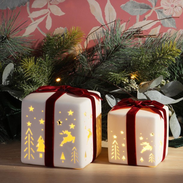 White and Red Ceramic Christmas Present Ornaments by Laura Ashley, preiluminado, ideal para crear un ambiente navideño romántico y acogedor. Requiere 3 x LR44 no incluidas. Función temporizador. 90% Cerámica, 8% Poliéster, 2% Plástico.
