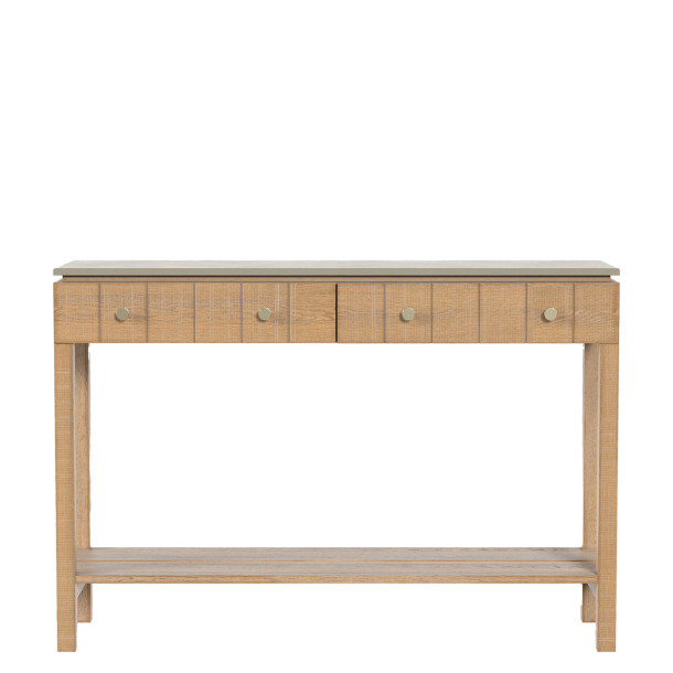 A 2-drawer console table crafted from solid oak and oak veneer with a delicate bleached and distressed finish, this console table features a sintered stone top in a warm gray with gold accents on the oak hardware. This 2-drawer console table features a gorgeous mitered front that will add a touch of charm to your home.