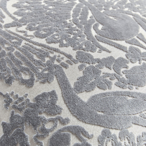 Peacock cushion with a velvet peacock design in steel grey tones. Measures 50cm x 50cm. By Laura Ashley