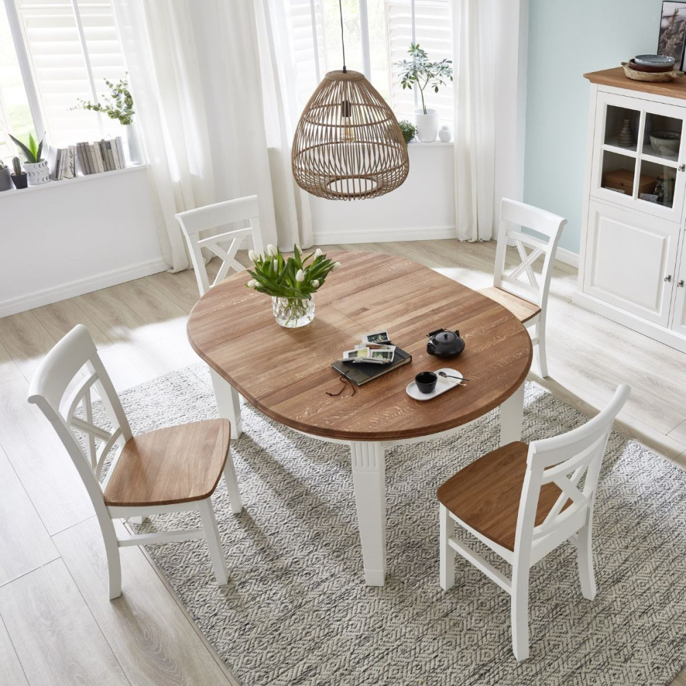 AVONDALE: A collection of furniture for living rooms and dining rooms, rustic Provencal style, made of solid oak wood and oak DM, combined with white painted bases, with a variety of pieces, shapes and sizes that make it a very versatile option. for your home.