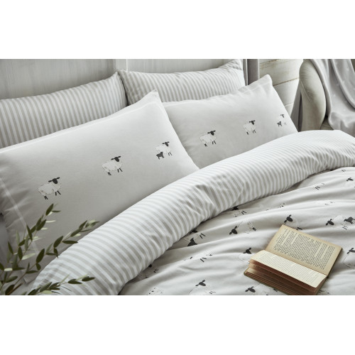 Sheep Bed Set printed with Funny and placid sheep , in 100% Brushed Cotton.. Reverse Beige stripes.