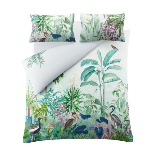 Glasshouse Bed Set printed with vibrant array of exotic birds and lush foliage , in 100% Cotton sateen. 220 thread count. Digitally Printed.. Reverse a more subtle, muted green landscape.