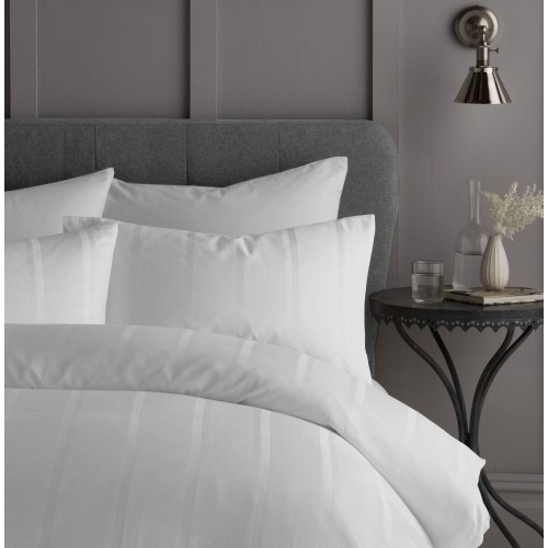 Henry duvet cover set in white by Luxe & Wilde, made of 100% cotton with 200 thread count. Features a wide stripe design with classic style and matching pillowcases, ideal for timeless elegance in your bedroom.