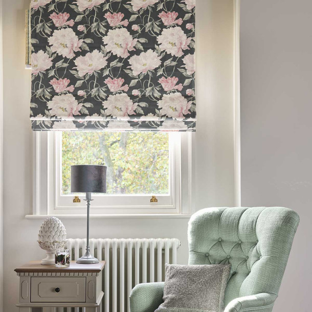 Peony Flower Fabric with stem and leaves Dark Smoke Grey.