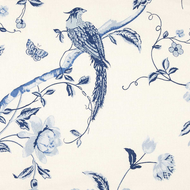 Fabric of Flowers and leaf on branches with exotic birds Royal Blue.