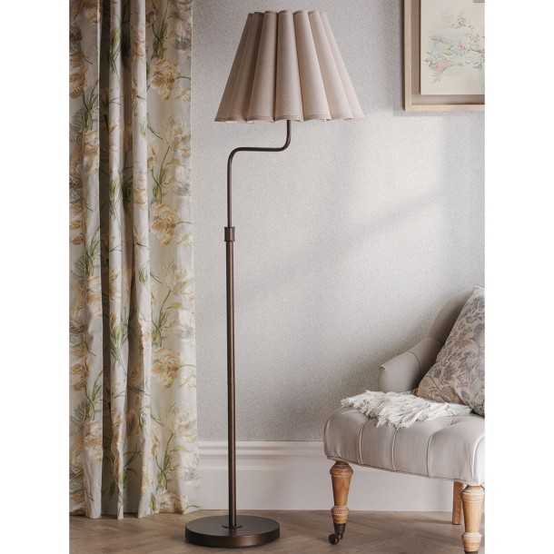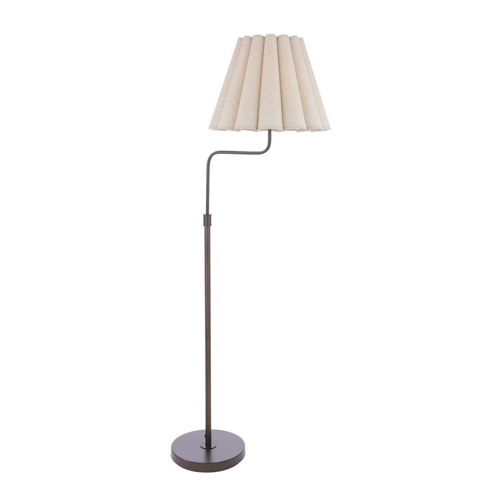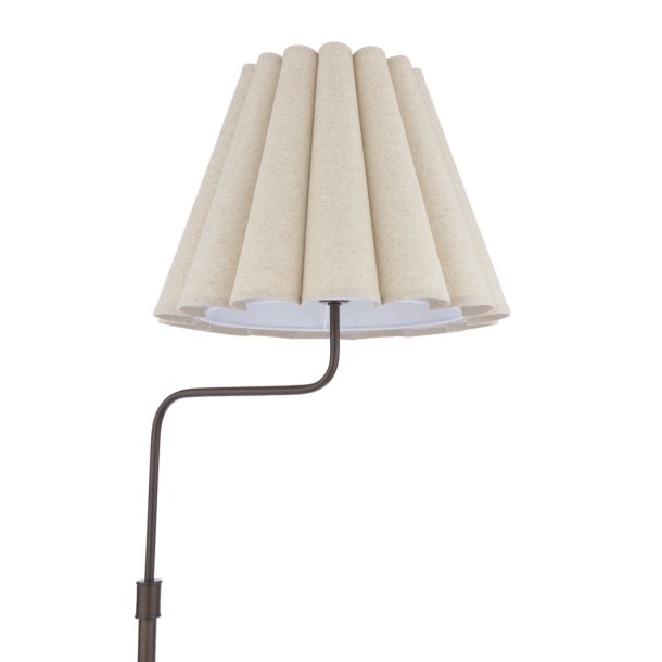 The HOLWELL floor lamp in antique bronze with natural linen shade spreads a soft glow, ideal for cosy reading corners or living rooms. Its vintage-inspired design blends with modern interiors, making it a timeless statement piece for your home.
