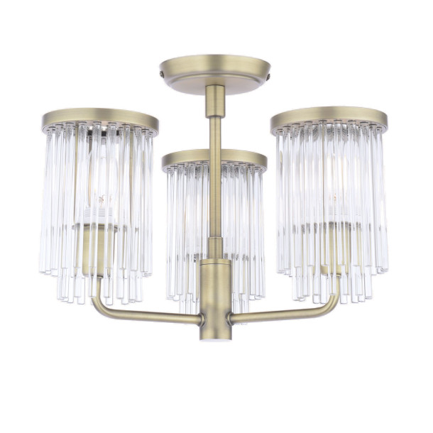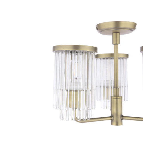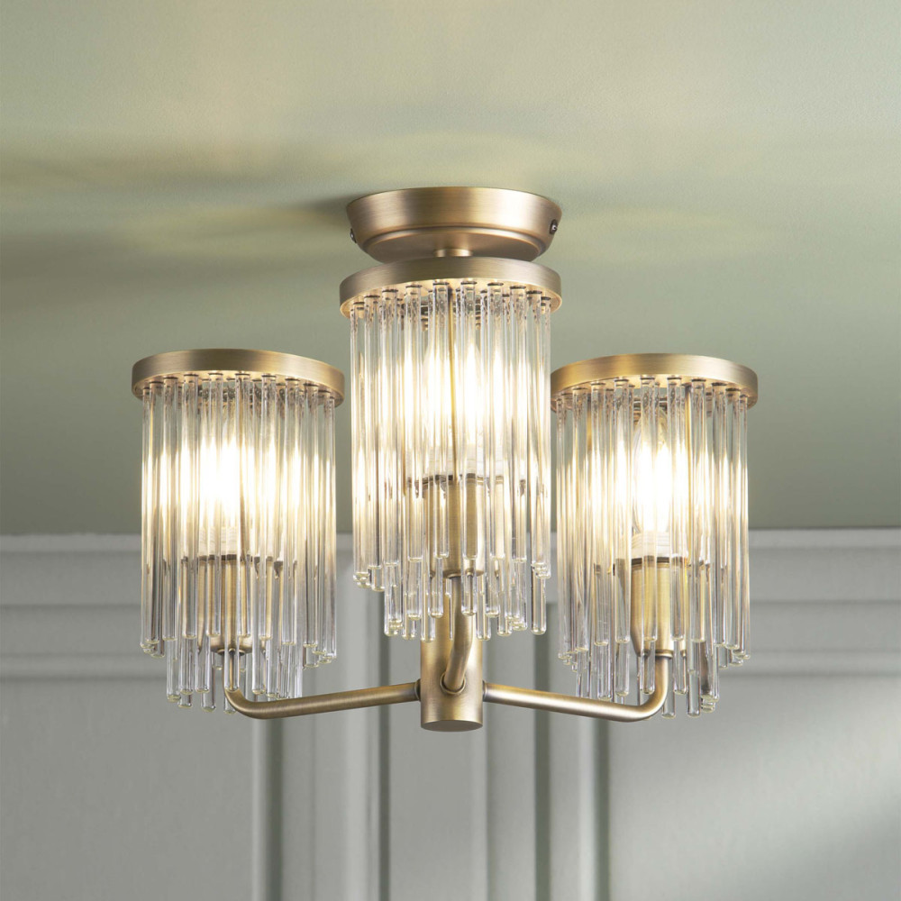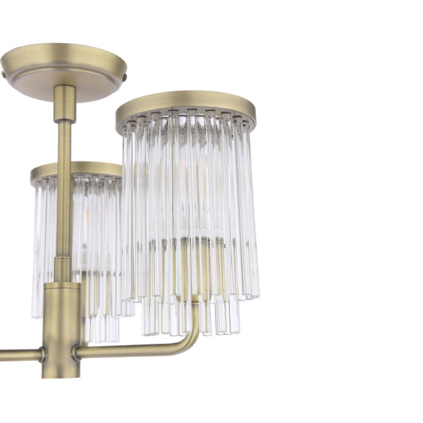 Semi flush lamp with matt antique brass finish and glass rods. Perfect for low-ceiling bedrooms with classic charm.