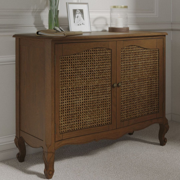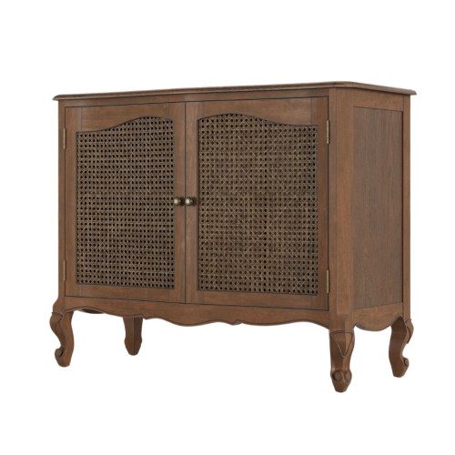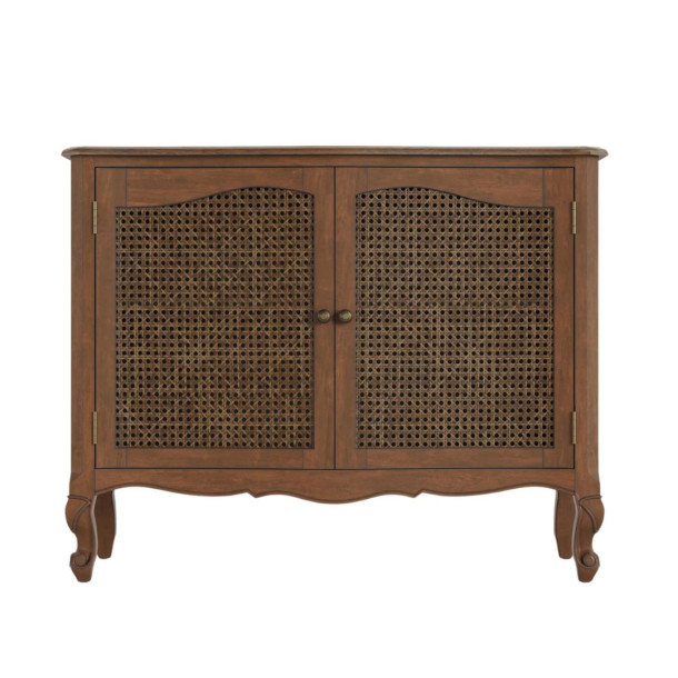 Its shapely doors are dressed with rattan cane panels and antique brass handles, concealing a full-width storage space comprising an adjustable shelf.