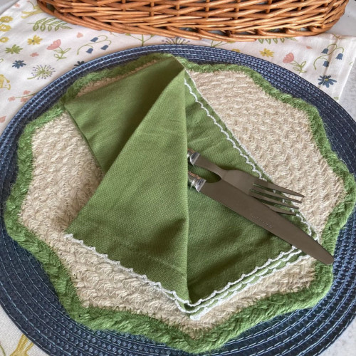 Set of 4 green cotton napkins with a white scalloped hem, to fill your table with elegance.