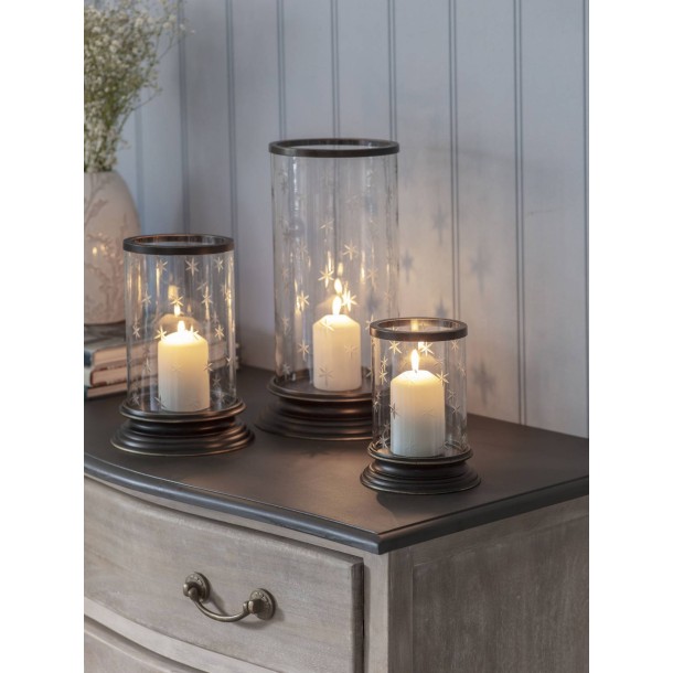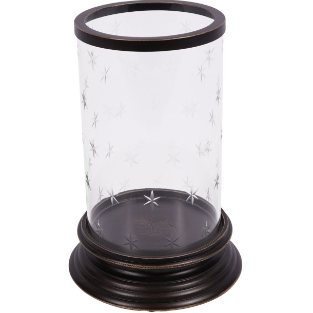 Timeless candle hurricane lantern featuring dark bronze base and rim with gold highlighting and a glass drum flute decorated with hand cut stars. Decorative stars are handcut so natural variations in size and shape will occur. Will add style and elegance to any room. Available in three sizes. 16cm diameter x 25cm height.