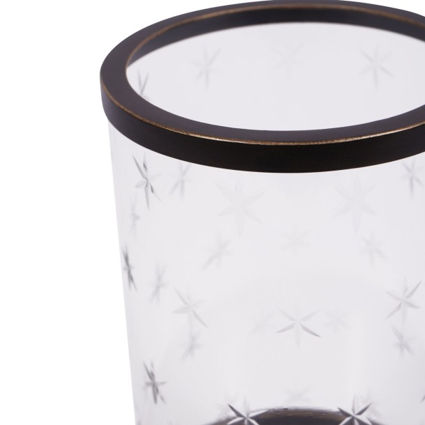 Timeless candle hurricane lantern featuring dark bronze base and rim with gold highlighting and a glass drum flute decorated with hand cut stars. Decorative stars are handcut so natural variations in size and shape will occur. Will add style and elegance to any room. Available in three sizes. Dimensions 12cm diameter x 15cm height.