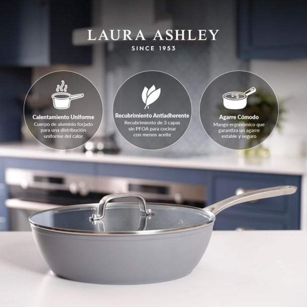 Designed for Comfort and Durability: The ergonomic stainless steel handle of saute pan provides a secure grip, making it easy to manoeuvre even when full. Embossed with the Laura Ashley logo, it adds a touch of elegance to your kitchen.