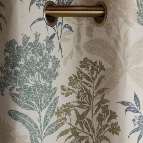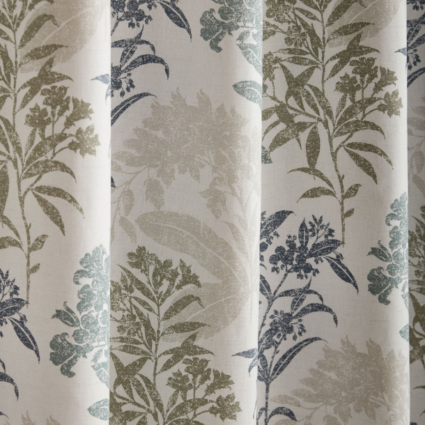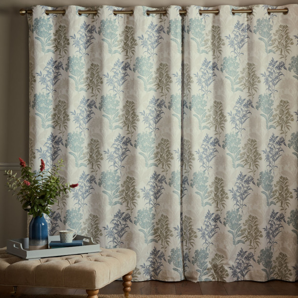 Tenby Ready Made Curtains, Silhouette Flower Design, Sea Blue. Eyelet Header and Blackout Lining. Various Sizes Available. By Laura Ashley.