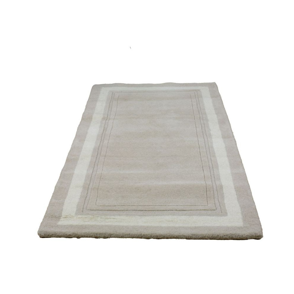 Natural wool rug, in hazelnut beige, with a classic design and a contrasting neutral center border.