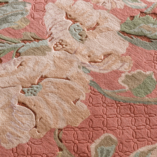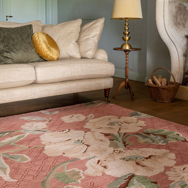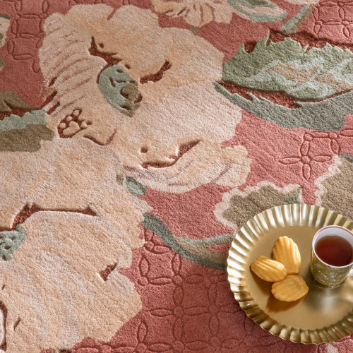 Laura Ashley cut-pile wool rug with floral, hibiscus and leaf design in terracotta. Available in different sizes.