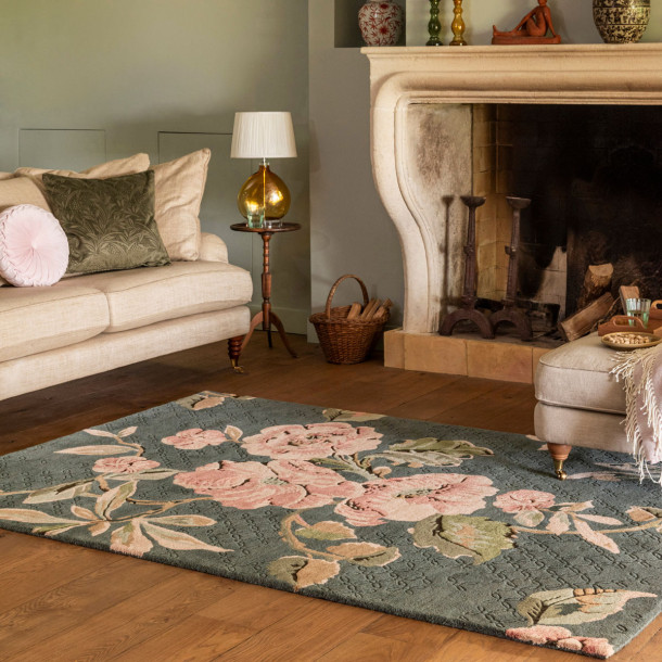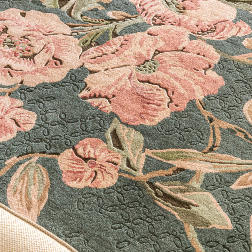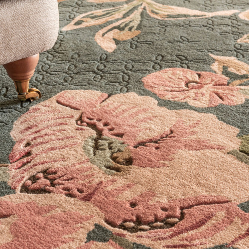 Laura Ashley cut-pile wool rug with floral, hibiscus and leaf design in fern green. Available in different sizes.