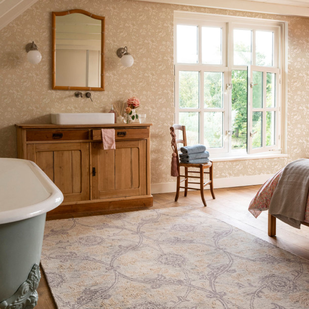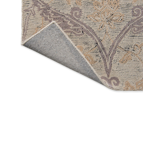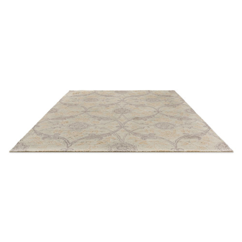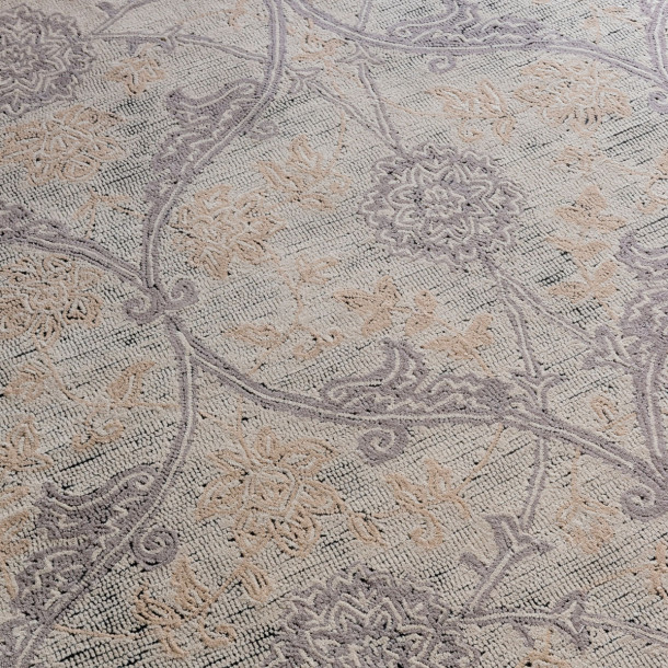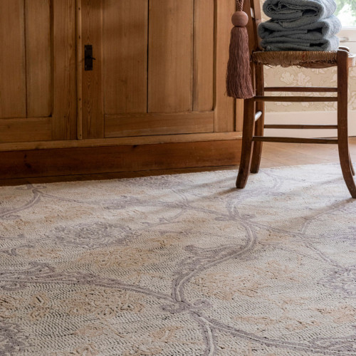 Laura Ashley cut-pile wool rug with interlaced damask design in soft truffle and purple tones. Available in different sizes.