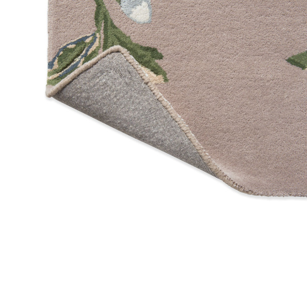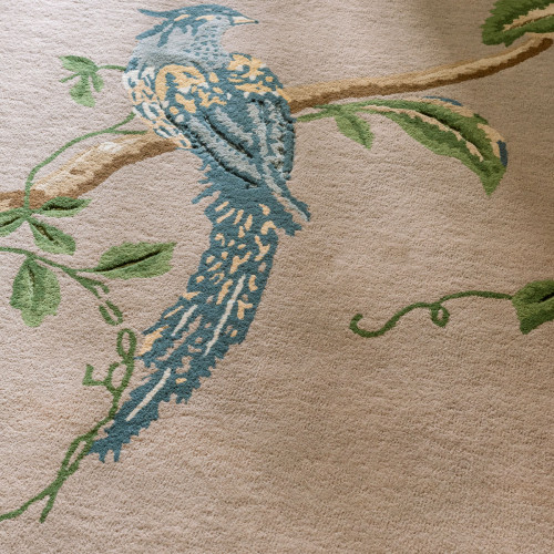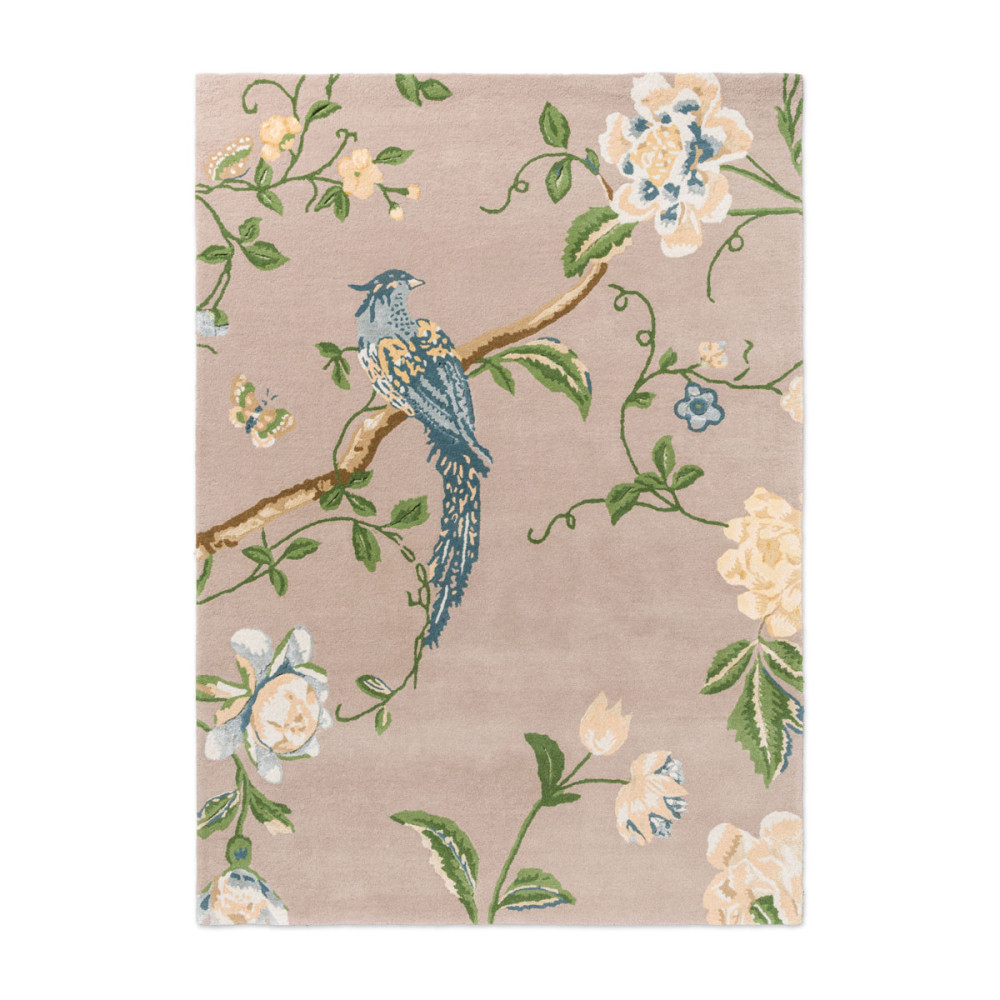 Laura Ashley cut-pile wool rug with a floral and bird-of-paradise design in truffle and sea blue tones. Available in different sizes.