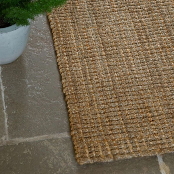 Natural jute rug with a striped design, perfect for adding a fresh touch to your home.