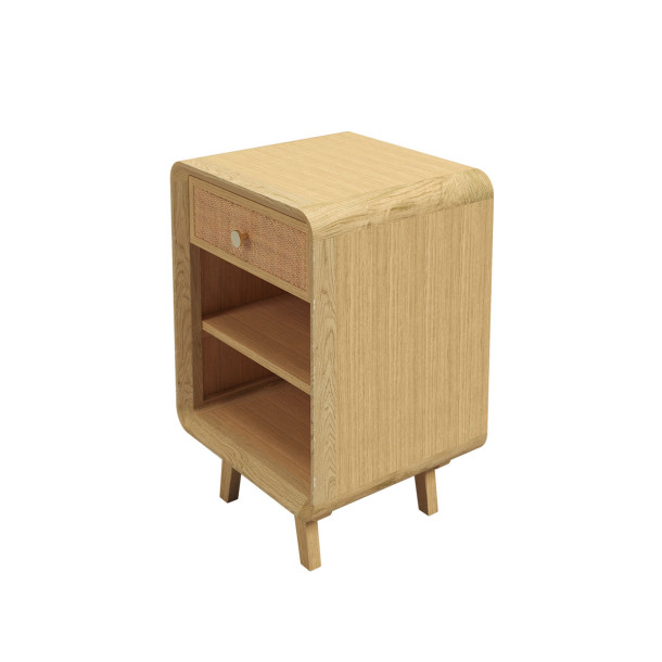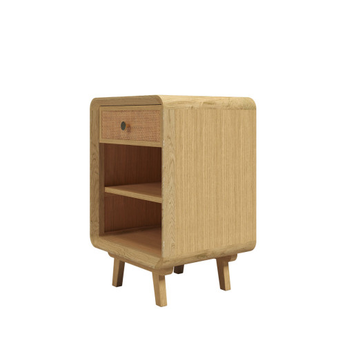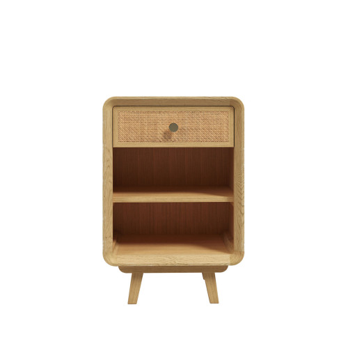 <span>Millen Bedside table, in a combination of oak and rattan, made of solid oak and oak veneer, with a rattan drawer front and gold fittings. This bedside table has one drawer and two shelves that offer plenty of space for your essentials.</span>