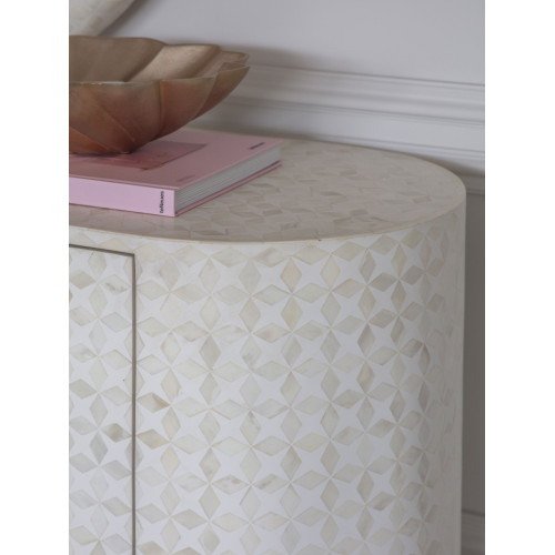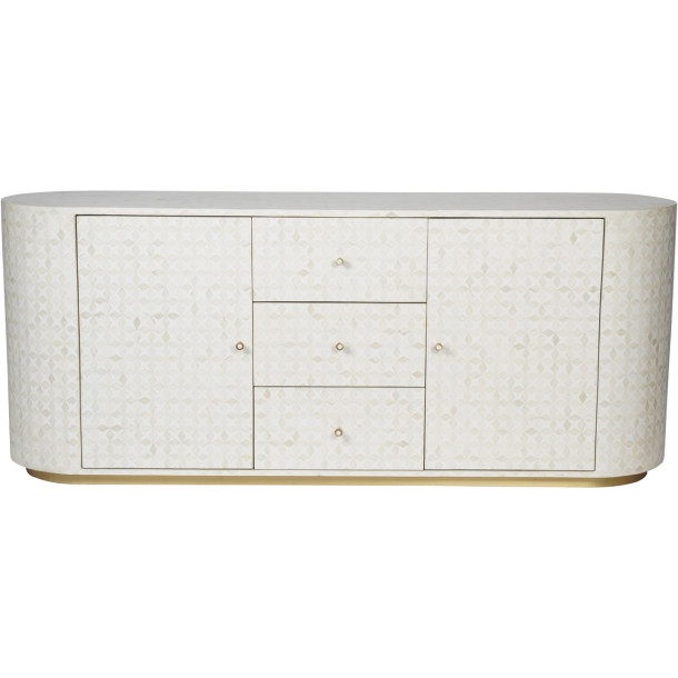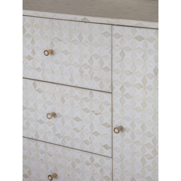 The Aspen Bone Inlay Two Door & Three Drawer Sideboard commands attention with its elegant curved edges and stunning bone inlay design. Resting on a contrasting antique brass plinth, each door conceals a fixed interior shelf for added practicality. The Aspen Sideboard blends intricate Indian handicraft with functionality, keeping traditional decorative art alive. The Aspen collection includes a Two Door Bar Cabinet and round Mirror.