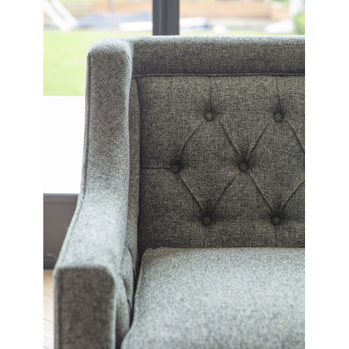 Enhance your space with this Forest Green three-seater sofa from our popular Theodore collection. The woven fabric blends green and dark grey tones, creating a rich, speckled texture that pairs beautifully with deep buttoning and piped detailing. Supported by a solid deep brown wooden frame, it measures 200cm in length and requires simple self-assembly. Also available in Dark Taupe, Ivory, and Warm Grey.
