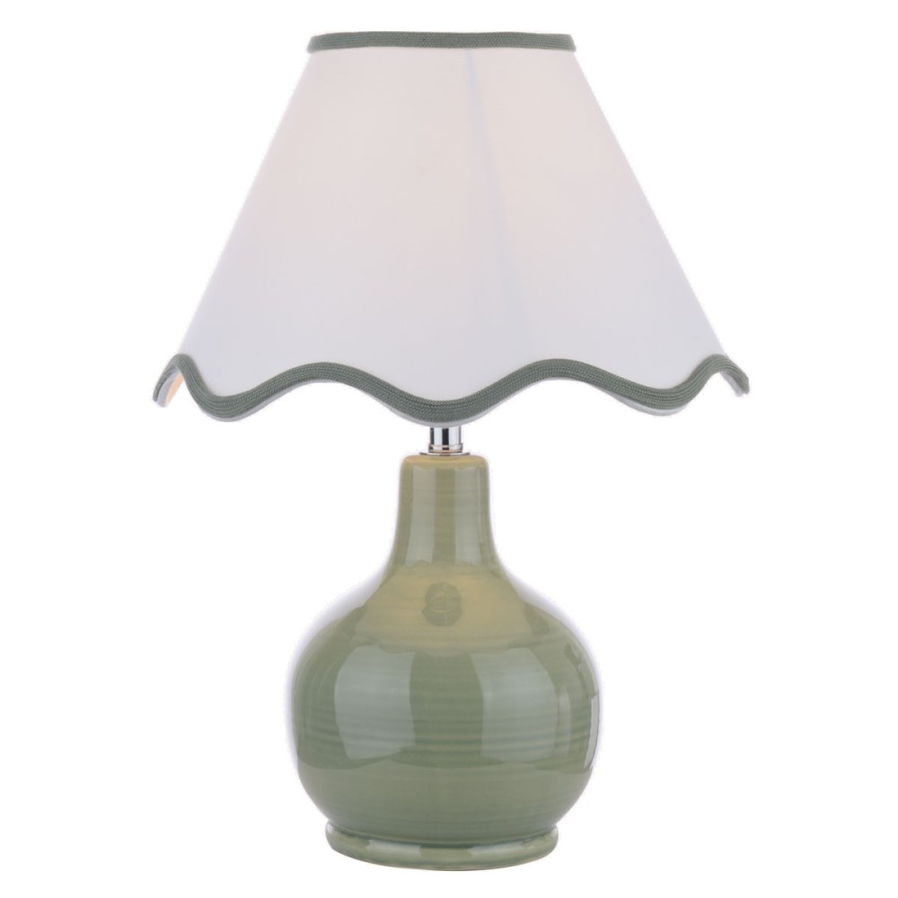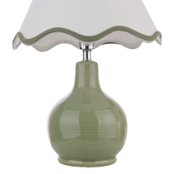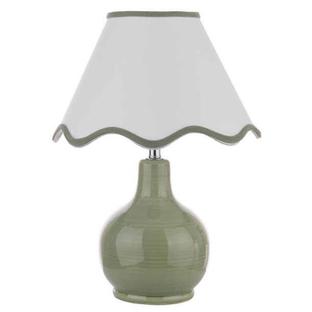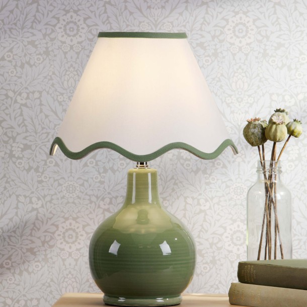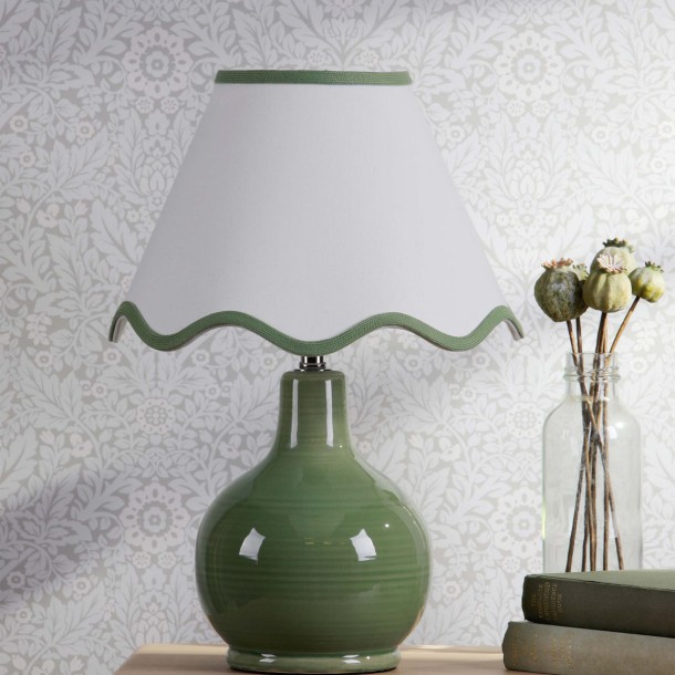 The BRAMHOPE table lamp in green with scalloped shade trim adds depth and elegance. Perfect as a bedside or console piece, it provides a warm glow with timeless Laura Ashley style.