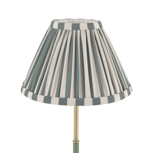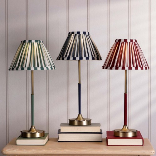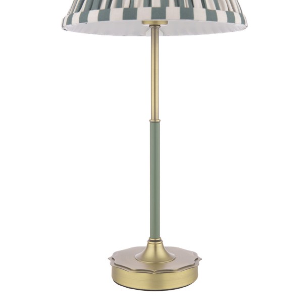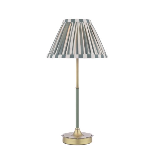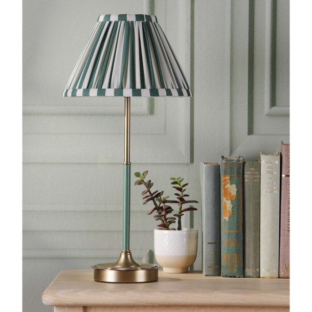 The DENWICK table lamp in antique brass with green striped shade creates a vintage look. Perfect for living rooms, halls or bedrooms, it adds character and timeless Laura Ashley style.