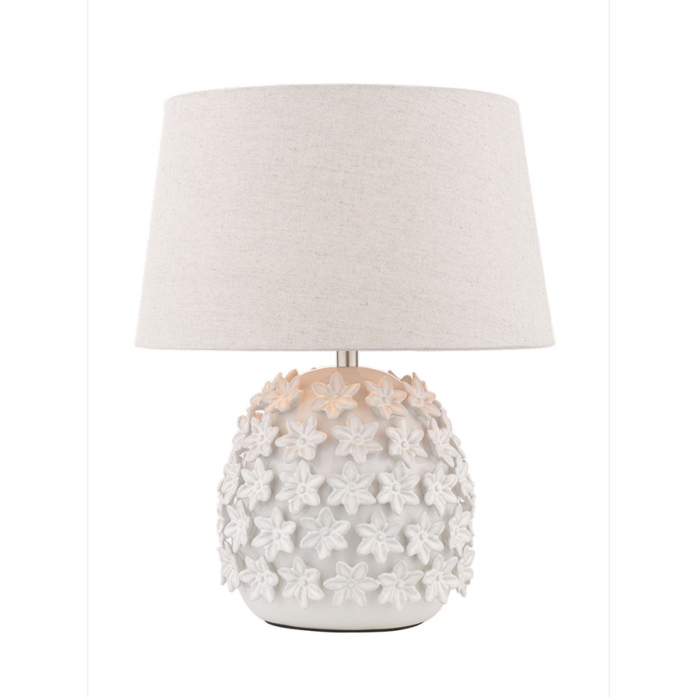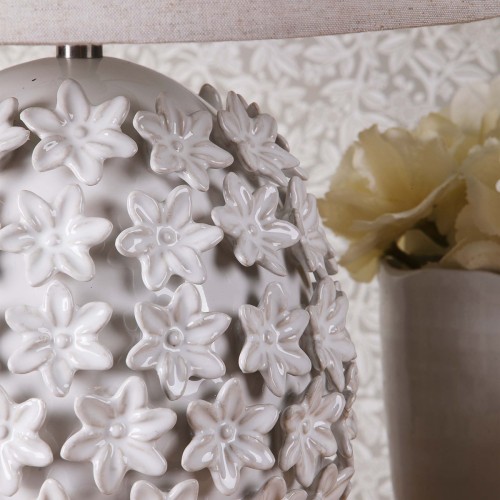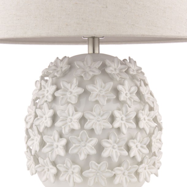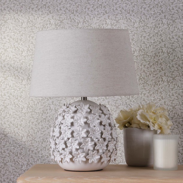 The INGHAM table lamp in white ceramic with floral pattern and natural shade brings romantic charm. Perfect for side tables, entryways or living rooms, it casts a warm, inviting glow.