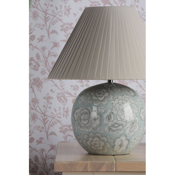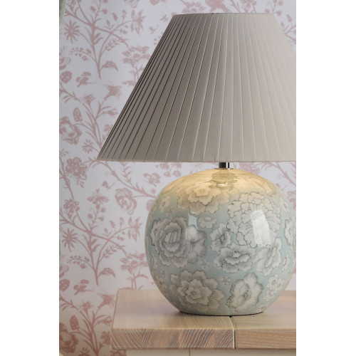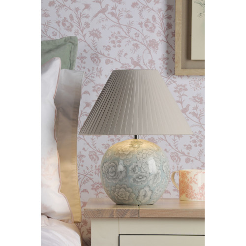 The Laura Ashley Montford Table Lamp, with round ceramic base and blue floral pattern, adds a splash of colour. Ideal for end tables in living rooms or bedside tables in bedrooms.