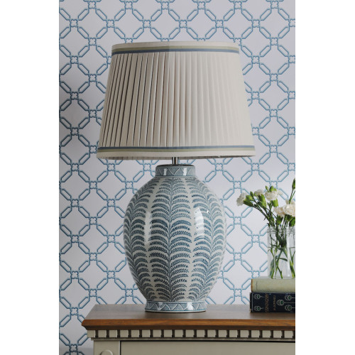 The Laura Ashley Stannard Table Lamp, with large pleated shade and coloured trim, adds sophistication. Perfect for end tables or bedside lamps.