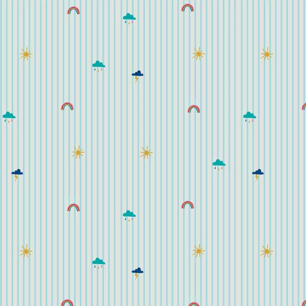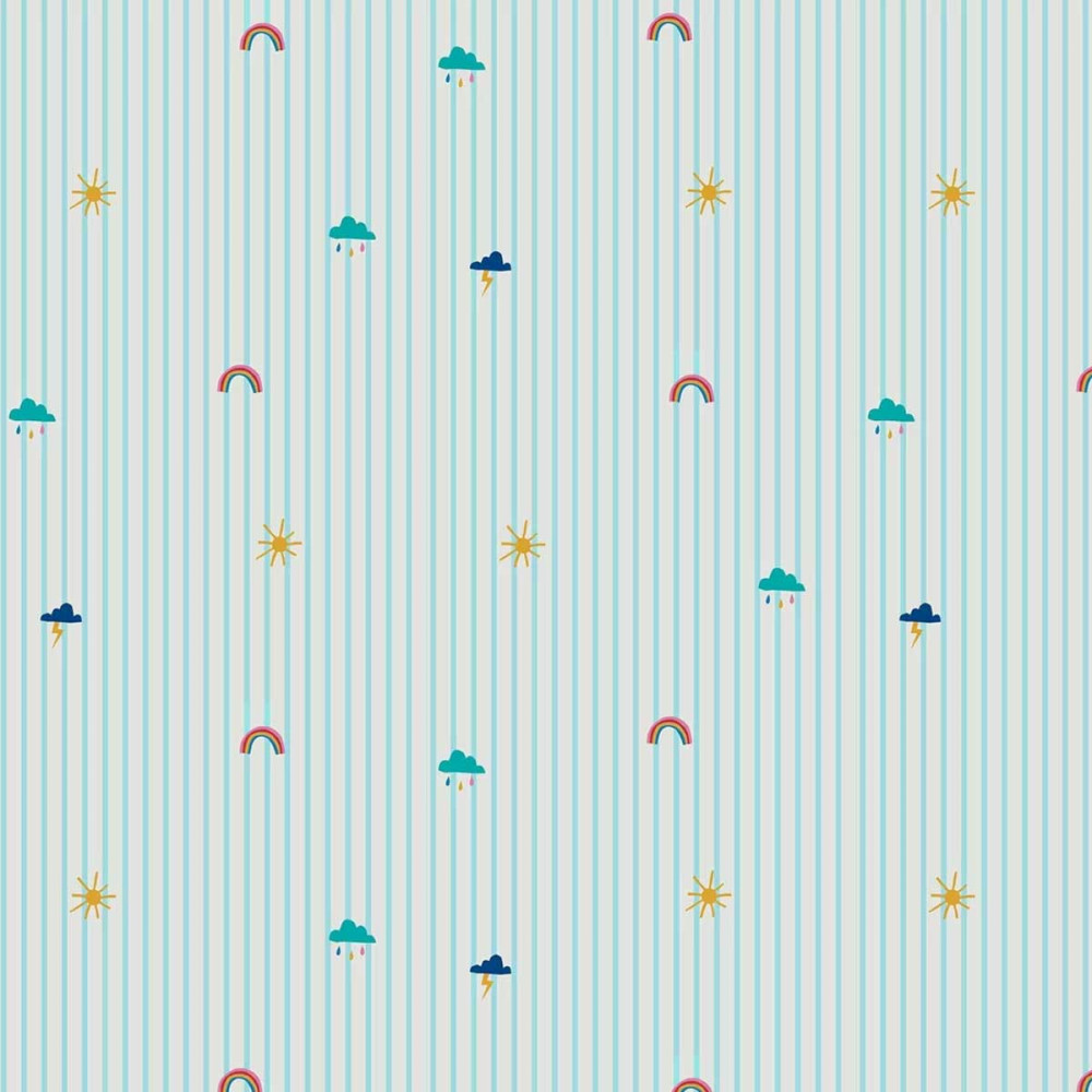 Brighten any child’s room or playroom with the charming whatever the weather icons wallpaper. This fun design has quirky weather icons from rainbows to sunshine and storm clouds to rain clouds each perfectly scattered upon a Azul Niebla ticking stripe background. This lovely design has a large repeat for impactful scale. Printed on a matt substrate for a contemporary look and feel. This wallpaper is also paste-the-wall, making it easy to hang.