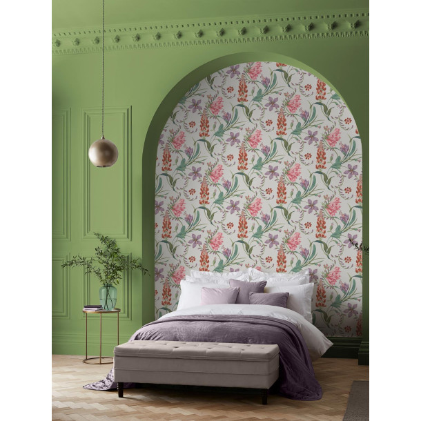 Charming pink, purple, and red flowers intertwined with lush green leaves on a bright white background, making it the perfect choice for your interior design projects printed wallpaper. Coloured in Pink, from Graham & Brown collection.52 x 1000 cm Roll