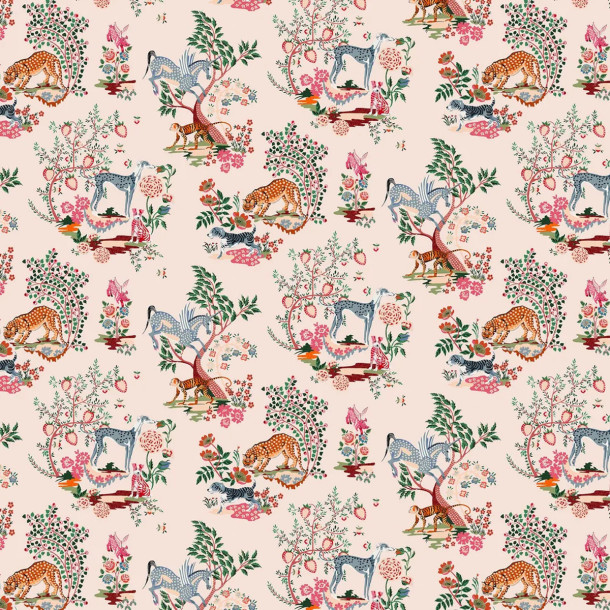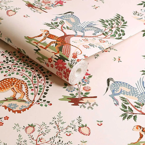Painted Kingdom Pink Pink Wallpaper 10m presents a magical kingdom scene with whimsical creatures and floral elements, perfect for imaginative and dreamy interiors.