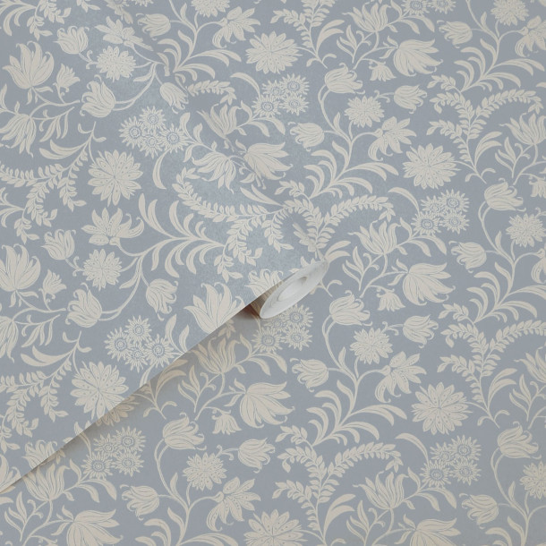 Soft blue floral wallpaper with tulips and chrysanthemums on curling stems. Adds freshness and natural charm.