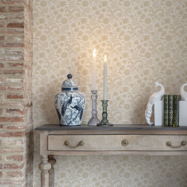 Caramel-toned floral wallpaper with tulips and chrysanthemums on curling stems. Perfect for warm, inviting spaces.